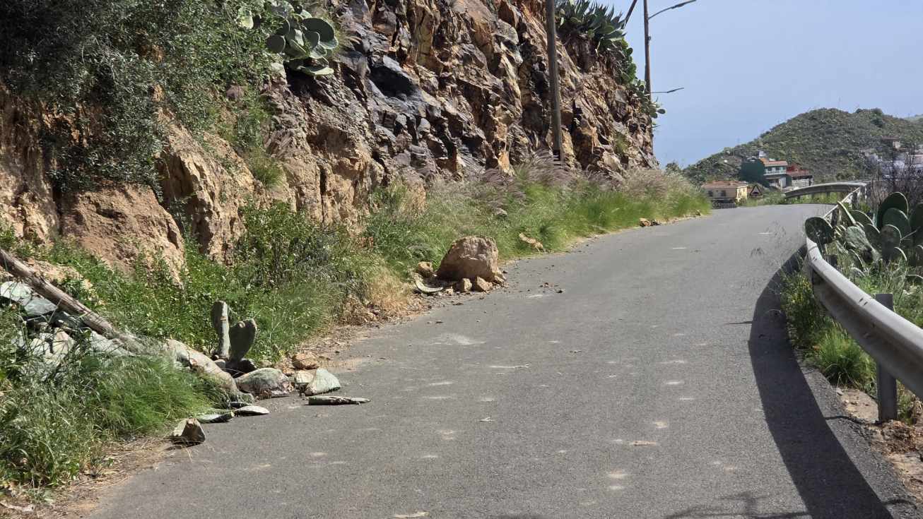 En otro punto cercano aún se observan piedras desprendidas del talud que permanecen en la calzada, evidenciando la inestabilidad del terreno y la ausencia de actuaciones de consolidación.