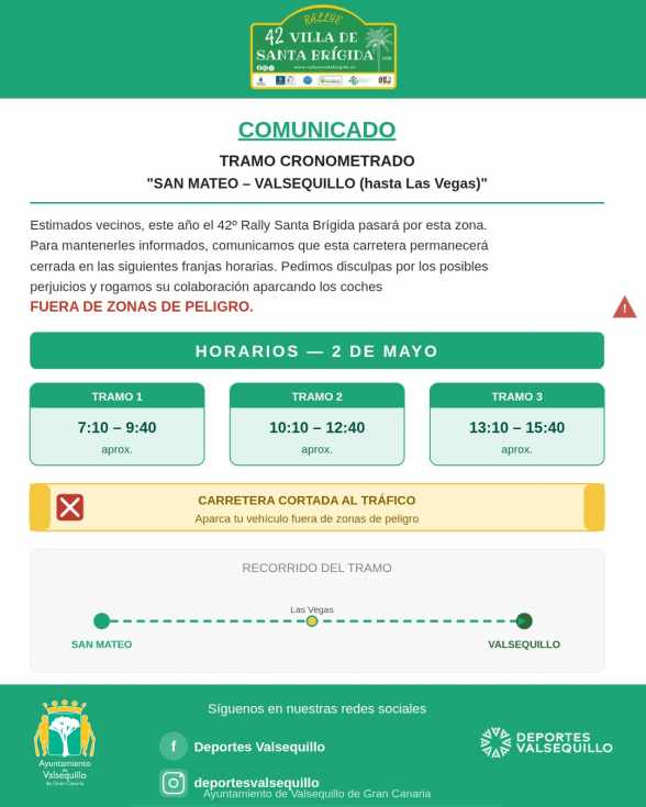 El Ayuntamiento de Valsequillo de Gran Canaria ha informado a la ciudadanía de los cortes temporales de tráfico previstos este sábado, 2 de mayo, con motivo del paso del Rallye Villa de Santa Brígida, que discurrirá por el tramo cronometrado entre San Mateo y Valsequillo hasta Las Vegas.