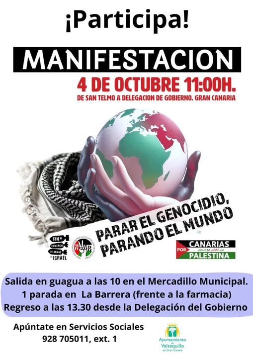 El próximo sábado 4 de octubre, el municipio de Valsequillo se sumará a la manifestación convocada en Las Palmas de Gran Canaria bajo el lema “Parar el genocidio, parando el mundo”, en solidaridad con el pueblo palestino.