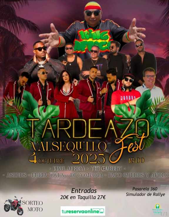 La fiesta cambia de ubicación y se desarrollará en el párking municipal de Valsequillo Casco, ofreciendo una alternativa de ocio seguro y vibrante para vecinos y visitantes. El “Tardeazo Fest” contará con un cartel de lujo para garantizar la diversión. La tarde estará amenizada por King África, los Aseres, Yet Garbey, Apolo y Paco Guedes, Dj JJ Compota y las orquesta Furia Joven. Una tarde que comenzará con Laslatinsisters, quienes prometen poner a bailar a todo el público presente a ritmo de bachata, salsa y chachachá.