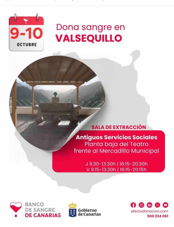 El Banco de Sangre y Tejidos de Canarias invita a la ciudadanía a participar en una nueva campaña de donación de sangre que se llevará a cabo en Valsequillo los próximos jueves 9 y viernes 10 de octubre.