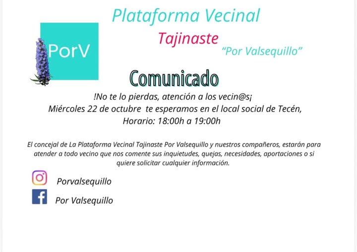 La Plataforma Vecinal Tajinaste Por Valsequillo sigue avanzando en su segunda ronda de reuniones por los distintos barrios del municipio, una iniciativa que busca acercar el trabajo vecinal a la ciudadanía, escuchar sus inquietudes, detectar necesidades y compartir información sobre asuntos de interés comunitario.