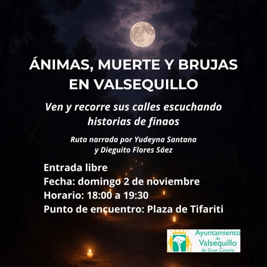 El Ayuntamiento de Valsequillo propone este fin de semana un viaje al misterio, la historia y las tradiciones orales del municipio con la actividad “Ánimas, Muerte y Brujas”, una ruta narrada por Yudeyna Santana y Dieguito Flores Sáez que promete sumergir al público en las leyendas y relatos de finaos que perviven en la memoria popular.