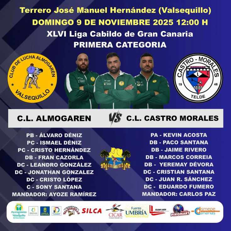 El conjunto valsequillero llega a esta cita tras imponerse por la mínima al Unión Gáldar (11-12) en una luchada muy igualada, con gran protagonismo de su trío de puntales: Álvaro Déniz (B), Cristo Hernández (C) e Ismael Déniz (C). Entre los tres sumaron la mayoría de los puntos que aseguraron el primer triunfo de la temporada, demostrando una vez más la fortaleza del plantel que dirige José Carlos Paz.