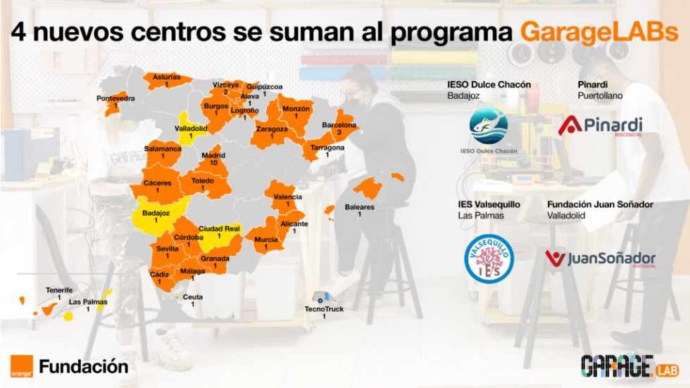 El IES Valsequillo (Las Palmas), el IESO Dulce Chacón (Badajoz), la Federación Plataformas Sociales Pinardi (Puertollano, Ciudad Real) y la Fundación Juan Soñador (Valladolid) son los cuatro centros elegidos para unirse a la nueva edición 2025-2026 del proyecto GarageLAB, impulsado por la Fundación Orange.