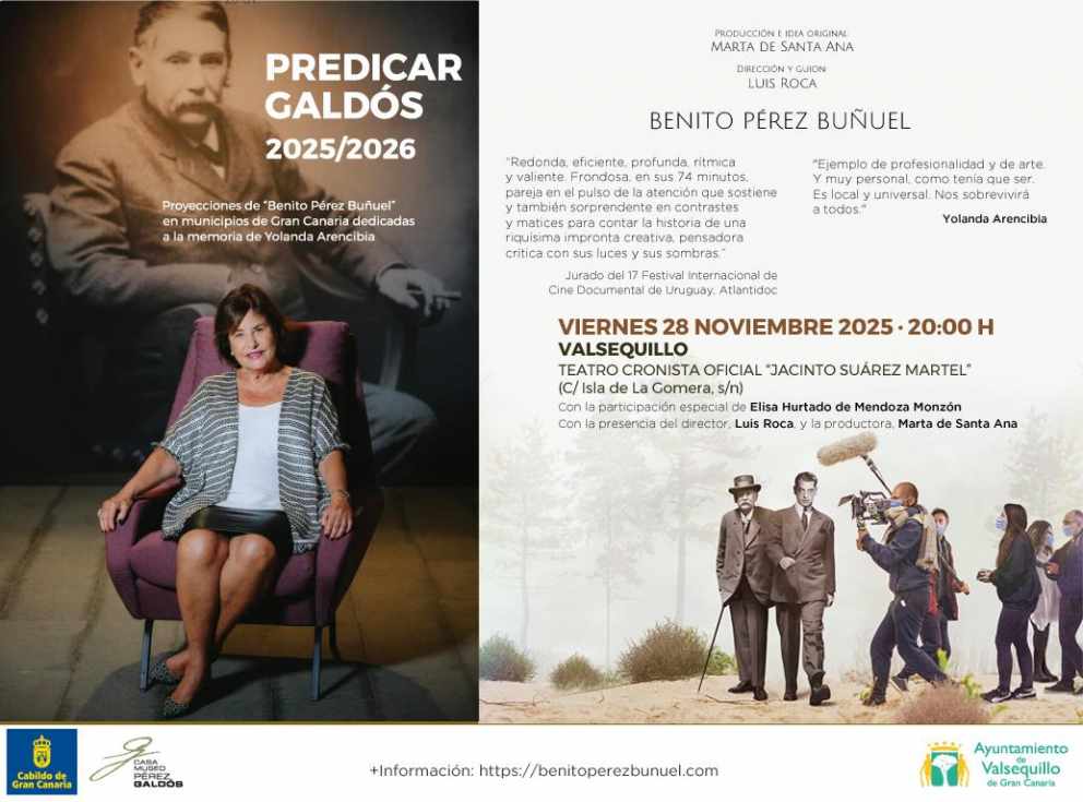 El ciclo insular Predicar Galdós 2025/2026, dedicado a la memoria de la catedrática y galdosiana Yolanda Arencibia, llega este viernes 28 de noviembre a Valsequillo con la proyección del premiado documental Benito Pérez Buñuel, una obra reconocida por su profundidad, ritmo narrativo y mirada creativa sobre la figura del escritor canario y sus zonas de luz y sombra.