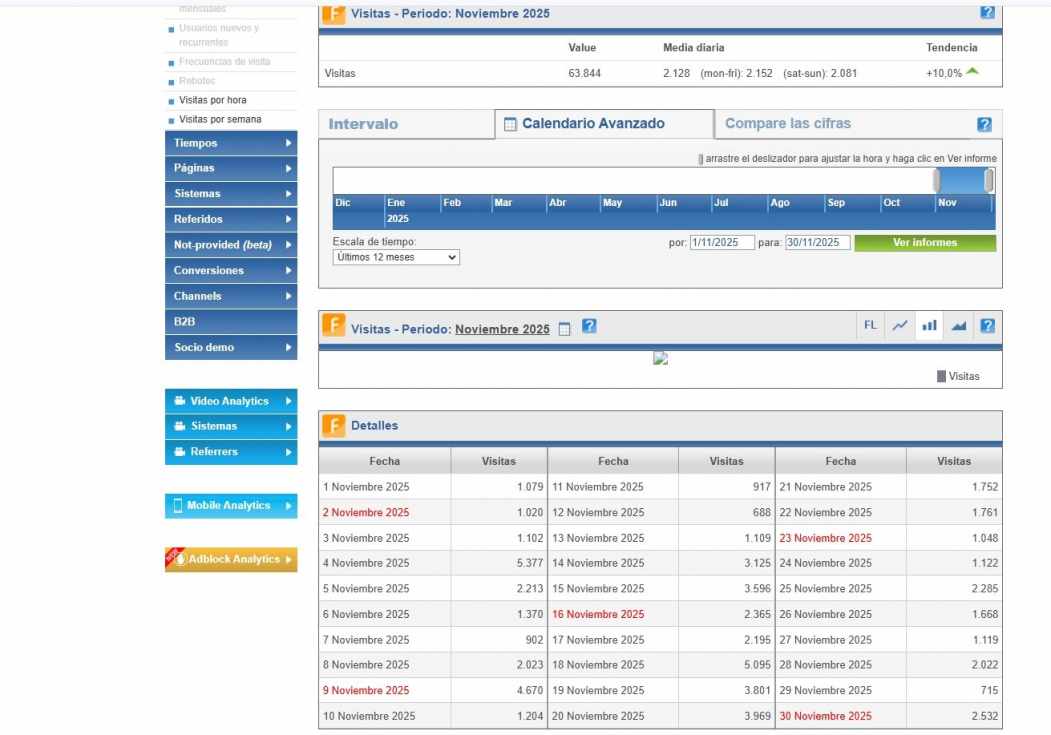 En cuanto a visitas, ShinyStat certifica 63.844 accesos durante noviembre, con una media diaria de 2.128, alcanzando picos cercanos a las 5.300 y 4.500 visitas en jornadas concretas en las que la actualidad generó especial interés.