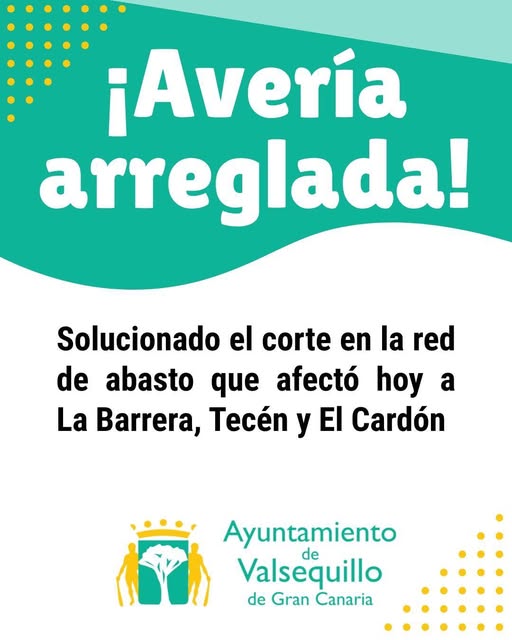 El Ayuntamiento de Valsequillo informa a sus vecinos de que la avería en la red de abasto que afectaba desde esta mañana del lunes a varias zonas del municipio ha sido completamente subsanada.