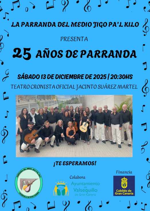 La Parranda del Medio Jigo Pa’l Kilo celebra este sábado 13 de diciembre sus 25 años de trayectoria con un espectáculo especial en el Teatro Cronista Oficial Jacinto Suárez Martel, en Valsequillo, a partir de las 20.30 horas. Una cita concebida para disfrutar en comunidad, compartir música canaria y rendir homenaje a un cuarto de siglo dedicado a preservar las tradiciones del municipio.