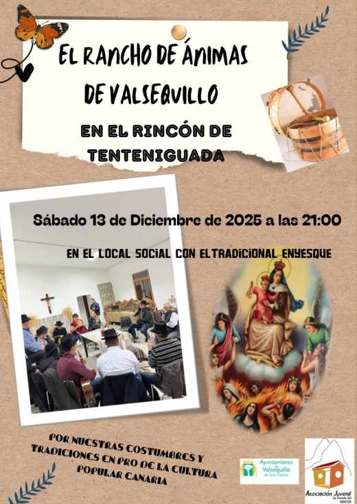 El Rincón de Tenteniguada acogerá este sábado 13 de diciembre, a partir de las 21.00 horas, una nueva edición —la número dieciséis— del tradicional encuentro con el Rancho de Ánimas de Valsequillo, una cita organizada por la Asociación Juvenil La Parada del Rincón y que se ha consolidado como uno de los actos más emblemáticos del municipio en torno a la cultura popular canaria.