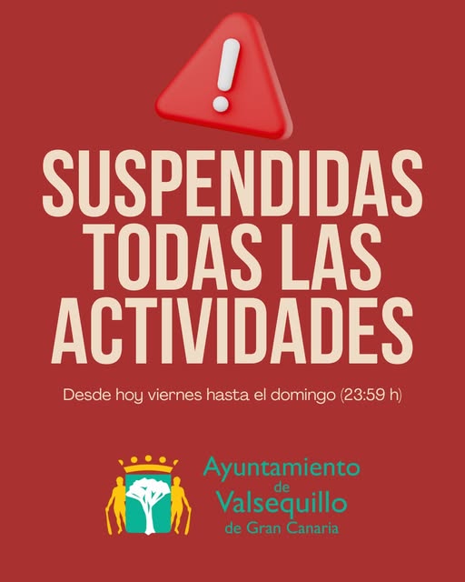 El Ayuntamiento de Valsequillo ha acordado este viernes la suspensión de todos los actos públicos previstos desde hoy viernes 12 de diciembre hasta el domingo 14 de diciembre a las 23.59 horas, tras la reunión mantenida esta mañana con la Dirección del Plan Insular de Protección Civil de Gran Canaria (PEIN).