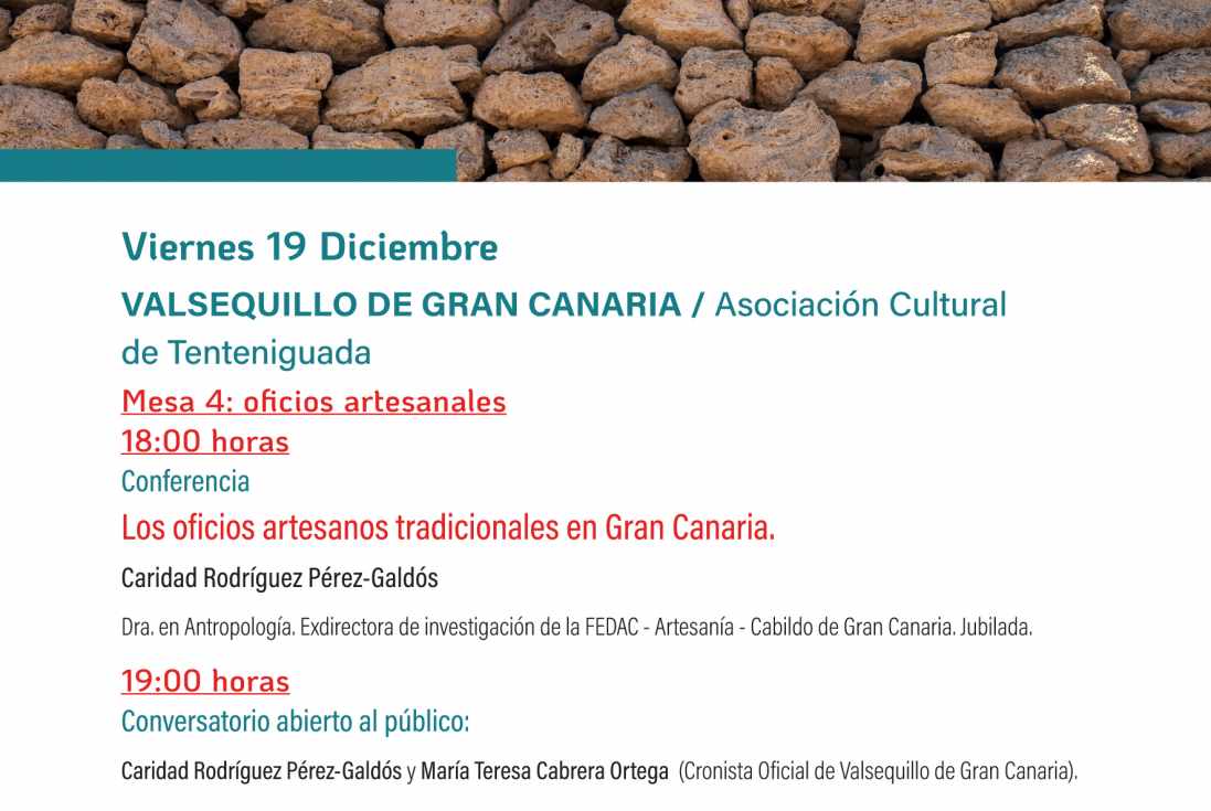 La jornada comienza a las 18.00 horas con la conferencia Los oficios artesanos tradicionales en Gran Canaria, a cargo de la doctora en Antropología Caridad Rodríguez Pérez-Galdós, exdirectora de investigación de la FEDAC–Artesanía del Cabildo de Gran Canaria. La ponente abordará la evolución histórica de los oficios, su valor etnográfico y su papel en la construcción de la identidad insular.