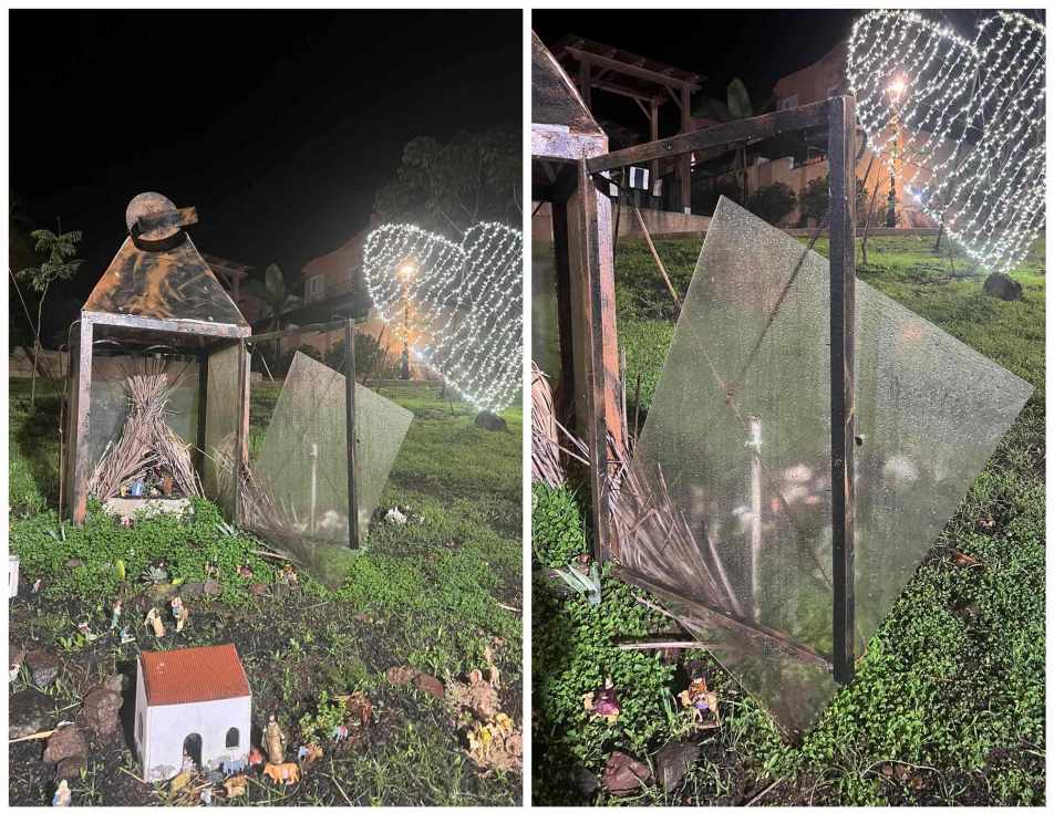 El belén, situado en una zona ajardinada y de paso habitual, permanece sin balizar ni señalizar, a pesar del evidente riesgo que supone la presencia de un cristal suelto a escasa altura del suelo.