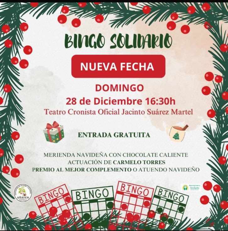 La Asociación de Vecinos Añaten celebrará este domingo 28 de diciembre su Bingo Solidario en el Teatro Cronista Oficial Jacinto Suárez Martel, a partir de las 16.30 horas, con el objetivo de convertir la solidaridad vecinal en apoyo real y directo para las familias más vulnerables del municipio, poniendo el foco especialmente en la población joven.