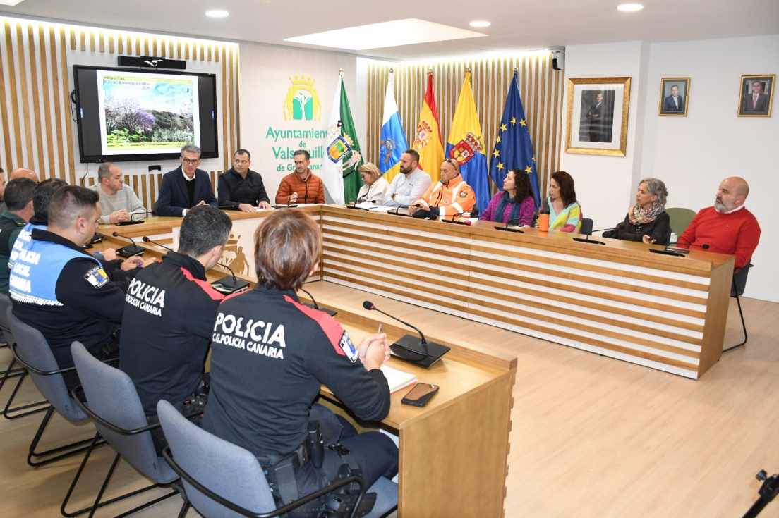 En la reunión participaron representantes de la Policía Local, Policía Canaria, Guardia Civil, Protección Civil, GLOBAL, el área de Carreteras del Cabildo, el responsable del plan de seguridad y el Centro de Salud de Valsequillo, junto al alcalde Juan Carlos Hernández Atta y los concejales de Cultura y Servicios, Armando Suárez e Ibán Medina.